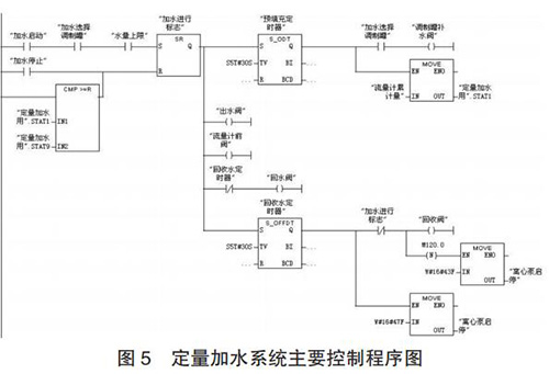 定量加水系统的工作过程为:当设定好加水量后,启动系统,多级离心泵 10、回流阀 4、出水阀 9 和流量计前阀 12开启对管路进行预填充;延时 30s 预填充完成后,回流阀 4关闭,调制罐补水阀 14 开启,同时质量流量计 13 开始计量;当质量流量计的累积量与设定加水量一致时,出水阀 9 和调制罐补水阀 14 关闭;调制罐定量加水完成后,开启回收阀17 和回流阀 4 以及同未关闭流量计前阀 12 一起,利用压缩空气对管道中水实现回收;延时 30s 水回收完成后,关闭多级离心泵、球阀 4、12 和 17,定量加水过程完成。定量加水系统主要控制程序如图 5 所示。